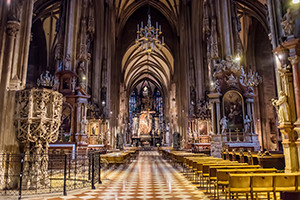 ウィーン旧市街のほぼ中心にあり、ひときわ高い尖塔をもつ教会。23万枚のタイルで作られた美しいモザイクの屋根も特徴的です。ハプスブルク家の墓所であり、モーツァルトの結婚式も葬儀もここで行われたとか。ミサをやっていない時間であれば、中を見学することもできます。 最も高い南塔の展望台からはウィーンの街が一望できますが、343段の螺旋階段を登る必要があるため、手軽に上に登りたい場合は、エレベーターが付いている北塔に登るのもおすすめです。