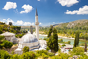 ボスニア・ヘルツェゴビナの一都市で、かつてこの地を支配していたトルコの名残りがある古都モスタルは、キリスト教の教会とイスラム教のモスクが同居する、オリエンタルで少しノスタルジックな雰囲気が感じられる街です。街の中心には、共存するキリスト教徒とイスラム教徒の平和の証である美しい橋が架かっており、この街の象徴であると同時に一番の写真スポットになっています。独特のアーチで中心が盛り上がった珍しい形状と、その下を流れる川の青色の美しさが印象的です。