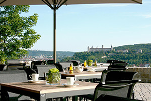 ライン川沿いに建つ古城ラインフェルスは、かつて実際にフランスとの戦争に使われた城。その大部分は破壊されてしまいましたが、17世紀に建て替えられた南側部分が現在ホテルとして利用されています。内部は当時の古い石材がそのまま用いられ歴史を感じるに十分。このホテルの魅力はなんと言ってもライン川を一望するロケーションにあり、特にレストランのテラス席は開放感が抜群で、宿泊者以外もわざわざ訪れるほど。