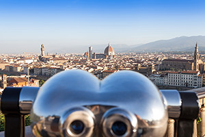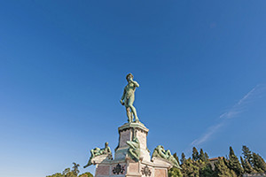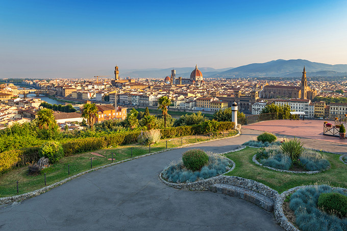 フィレンツェの街が一望できる人気スポット。フィレンツェを紹介する際にも、この広場から撮られた写真がよく利用されるなど、ここからの景色は絵になります。広場はフィレンツェの中心部から少し離れた丘の上に位置しており、地元の若者にも人気のデートスポットになっています。昼間の青い空、白い雲の下の街並みももちろん美しいですが、夕方になると夕陽とオレンジ色の屋根が映え、さらに暗くなるとドゥオーモやベッキオ橋に明かりが灯り、街を美しく彩ります。