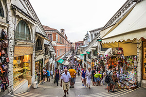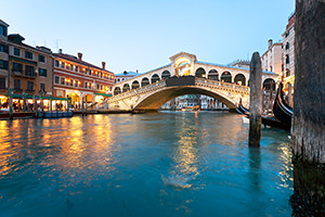 大運河にかかる最も有名な橋にして、絶好の写真スポット。かつては木造の橋でしたが、16世紀に今のような石橋として建設されました。橋の上はたくさんの店が軒を並べ、とても幅が広い事が特徴。この橋からは大運河を見渡す事ができます。カーブする大運河と豪奢な館の景色がとても美しく、ベネチアに来たからにはぜひともここで写真を撮っておきたいところですね。夜になると、運河の両岸の灯りが運河に映え、昼間とはまた違ったとても幻想的な雰囲気が楽しめます。