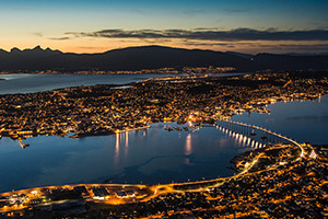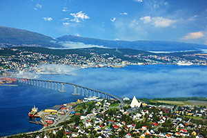 ノルウェー北極圏最大の街にしてオーロラ観測の拠点となる街です。 街はトロムソイヤ島とトロムスダーレンに分かれ、この2つを約1kmのトロムソ橋が結んでいて、この橋が街の象徴ともなっています。木造の家が続く美しい街並を散策でき、レストランもたくさんあります。ポーラー博物館、トロムスダーレン教会は是非観光しておきたいスポットです。ノルウェーの沿岸を航行する観光船の寄港地にもなっており、クルーズの拠点としても人気があります。