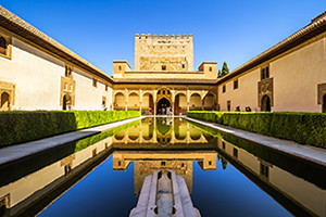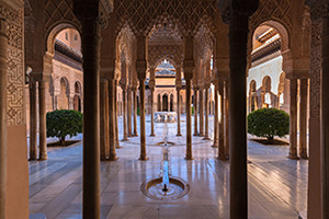 この街の見所は何と言っても「アルハンブラ宮殿」。イスラム建築らしく緻密な彫刻や幾何学模様などが至る所に施され、当時の世界最高水準の”アート”が楽しめます。特に「ナスル朝宮殿」では、イスラム建築の粋を集めたシンメトリーの美しい柱と庭園の建築美に驚かされる事でしょう。離宮である「ヘネラリフェ」では水と緑が調和した美しい庭園が楽しめます。時間があれば宮殿の向かいの丘にある「アルバイシン」へ。高台からグラナダの街を一望することができます。