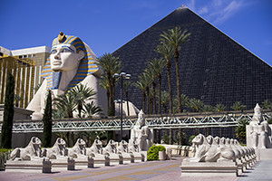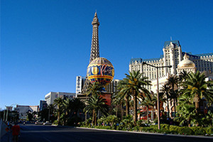 ラスベガスのメインストリート。数々の巨大ホテルがこの通り沿いに建ち並び、昼は車や人でにぎわい、夜には数キロメートルに渡ってネオンがきらめく、まさに眠らない街ラスベガスの象徴というべき豪華なストリートです。パリをモチーフにエッフェル塔が建つ「パリス」や、ベネチアを模したホテル「ベネチアン」、エジプトのピラミッドやスフィンクスが建つ「ルクソール」など様々で、このようなテーマホテルを順番に観光することをラスベガスではホテルホッピングと呼びます。