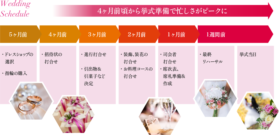 挙式の招待状の打合せがはじまる4ヶ月前、引出物や全体の進行の打合せが始まる3ヶ月前から、挙式準備は忙しさを増していきます。その間ハネムーンについてゆっくり考える余裕がなくなるケースが多いようです。